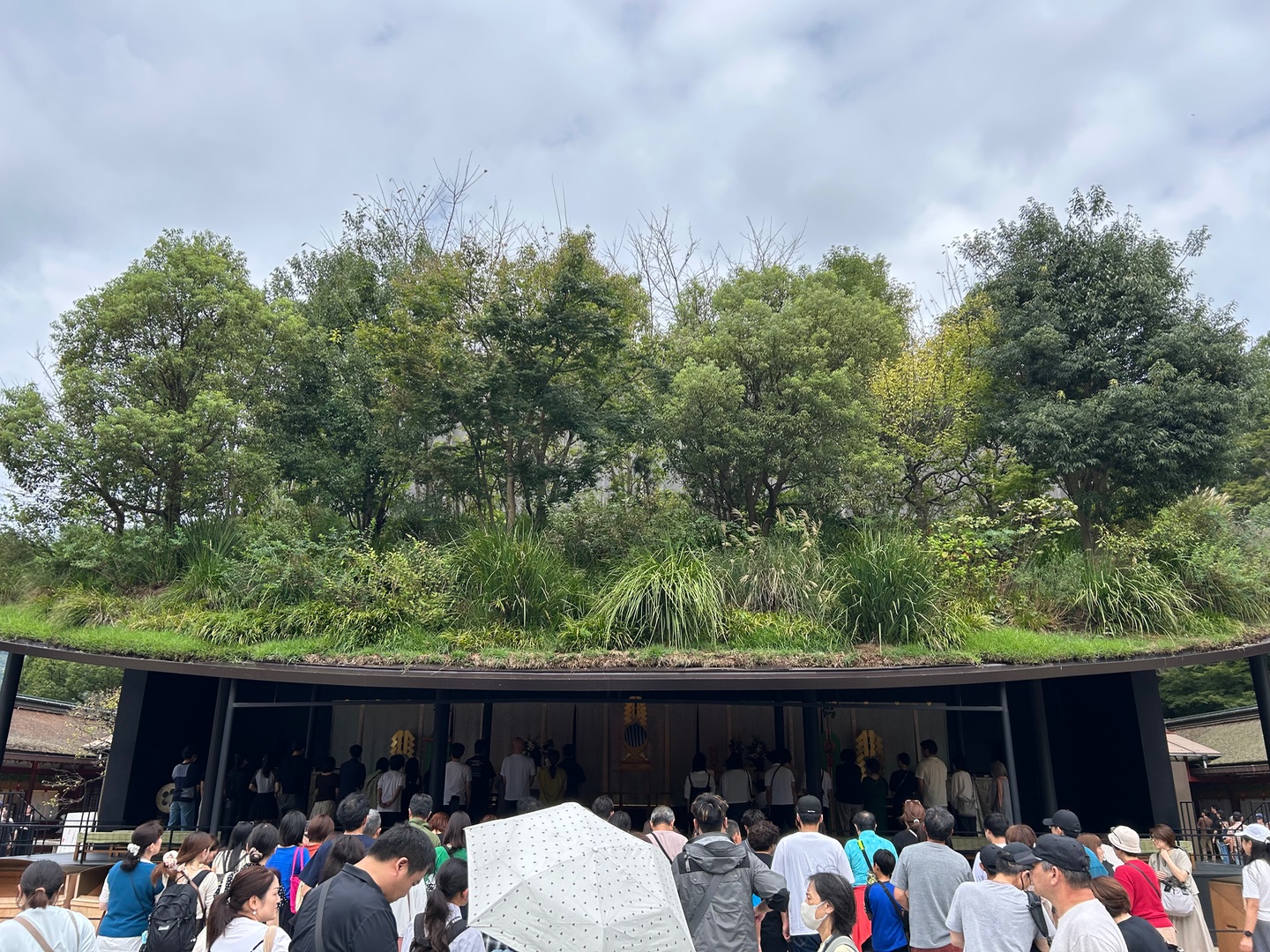 そして、今、太宰府は本殿の改修期間となっており、2027年春頃まで本殿工事が完了するまで仮殿が設置されています。この仮殿、2025年の大阪・関西万博の会場デザインプロデューサーを務めた注目の建築家、藤本壮介が手がけた3年限定のもの。「生きている屋根」と表現されてるのが一目でわかる感動的なものです。