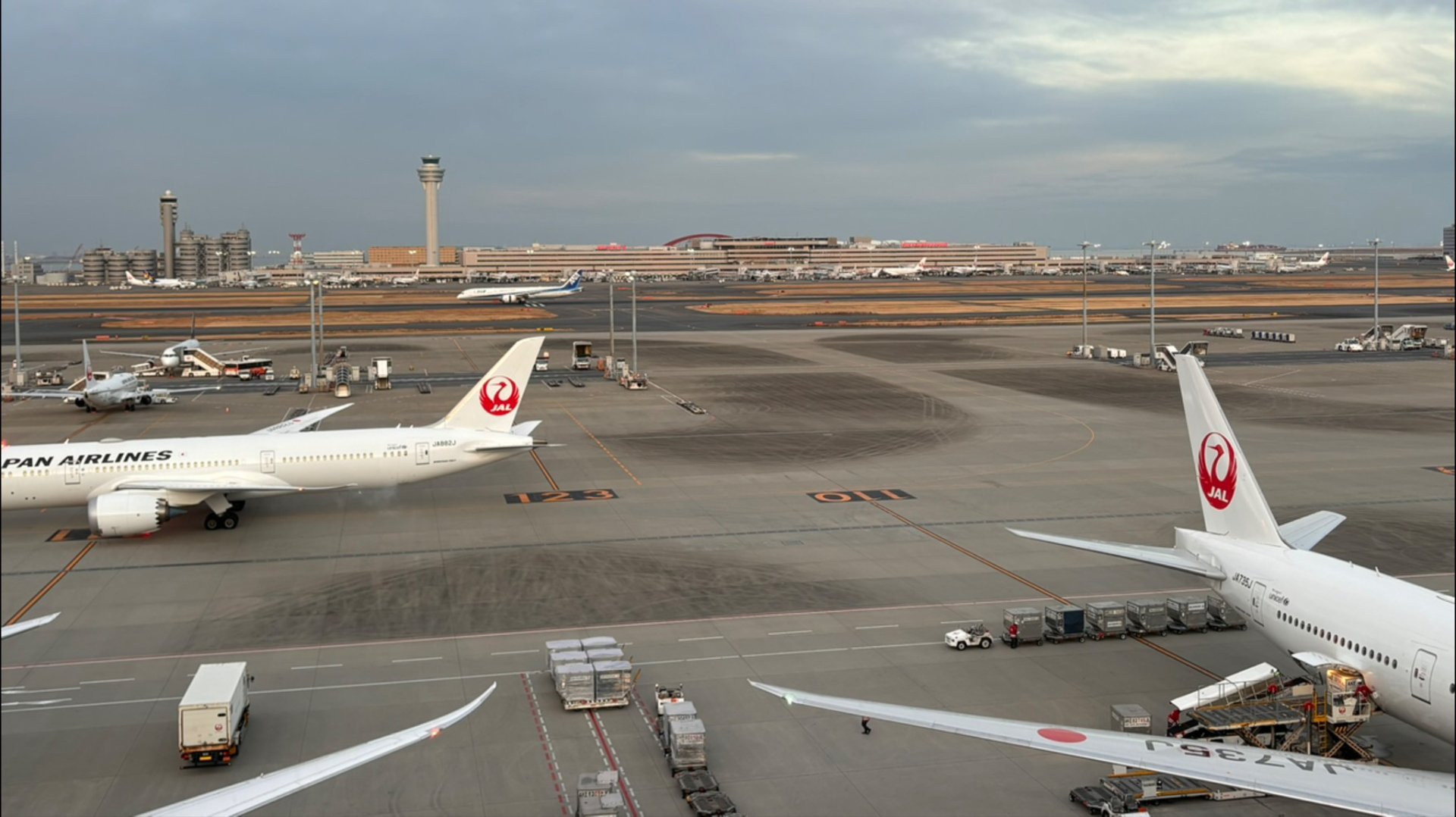 食後に展望デッキのベンチでJALの赤い翼が整然と並ぶ姿を眺めるのもおすすめ。