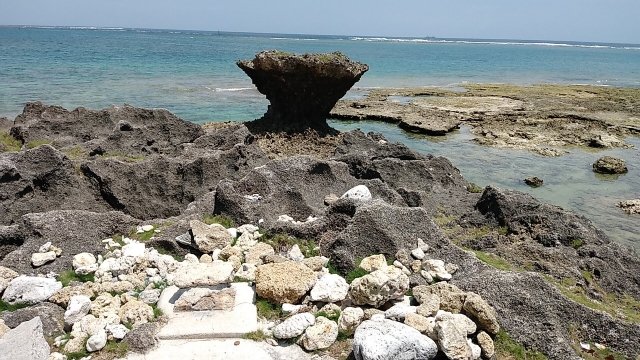 島の南東部には「竜宮神の拝所」という海の神様を祀る場所。キノコのような形をした奇岩が目印です。