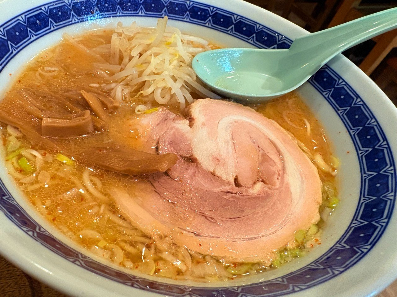 ラーメン自体の印象は“昔ながらの味噌ラーメン”風ですが、病みつきになりそうな仕上がり。鶏ガラのスープがベースらしく、あっさりしつつもしっかり旨みがあります。麺は自家製の細麺で、ツルツルとした喉ごしがいい。昔ながら感と思って食べると、全然レベル高いので、 驚きました。2人の仲間も同じ感想。