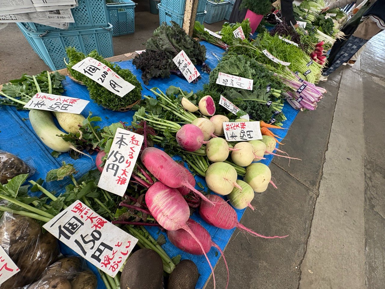 スーパーでは見ないような、やたら巨大な白菜とか、カラフルな野菜もゴロゴロしていて、見るだけでちょっとテンション上がる。スーパーではあまりみない品種もありますね。量のわりに値段も良心的。